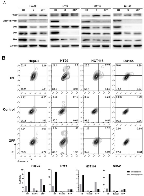 H9 regulates apoptosis in cancer cells. (A) Western blot analysis of apoptotic protein expression levels in HepG2, HT29, HCT116, and DU145cells transduced with H9, GFP or control. Cell lysates were labeled with antibodies against PARP, cleaved PARP, p53, p21Waf1/Cip1, Bax, and GAPDH. (B) Flow cytometry analysis using annexin V/PI staining to detect apoptosis in HepG2, HT29, HCT116, and DU145 cells treated with H9, GFP, and control.