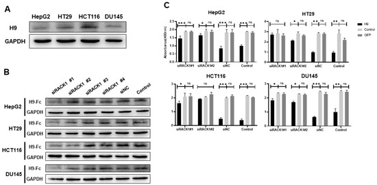 We discovered new antigens for the H9 antibody, particularly the antigen receptor for activated C kinase 1 (RACK1), which is notably important in regulating several cellular mechanisms in cancer. RACK1 is also related to neurovegetative diseases such as amyotrophic lateral sclerosis (ALS) and Huntington’s disease (HD) [38,39].