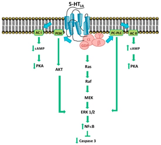 - Cowen, D.S.; Sowers, R.S.; Manning, D.R. Activation of a Mitogen-Activated Protein Kinase (ERK2) by the 5-Hydroxytryptamine 1A Receptor Is Sensitive Not Only to Inhibitors of Phosphatidylinositol 3-Kinase, but to an Inhibitor of Phosphatidylcholine Hydrolysis. J. Biol. Chem. 1996, 271, 22297–22300. [Google Scholar] [CrossRef] [PubMed]