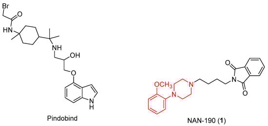 Further studies have also highlighted apoptosis resulting from downstream activation of PLCβ, Ras, and Raf-1 after stimulation of these receptors [12,13,14]. First, it is widely known that prostate cancer is closely related to a number of neuroendocrine cells that release serotonin and a high concentration of 5-HT1A receptors have been found in various prostate cancer cell lines (PC3, DU145, LNCaP) [15]. To prove this, there are several 5-HT1A antagonists, for example NAN-190 (Figure 3), containing an arylpiperazinic scaffold, or Pindobind, which have been shown to inhibit cell proliferation in vitro.