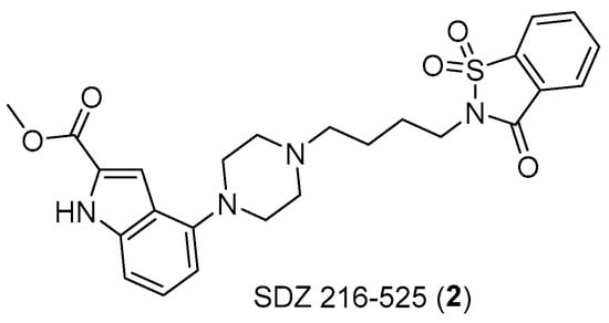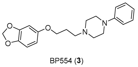 - Matsuda, T.; Seong, Y.H.; Aono, H.; Kanda, T.; Baba, A.; Saito, K.; Tobe, A.; Iwata, H. Agonist Activity of a Novel Compound, 1-[3-(3,4-Methylenedioxyphenoxy) Propyl]-4-Phenyl Piperazine (BP-554), at Central 5-HT1A Receptors. Eur. J. Pharmacol. 1989, 170, 75–82. [Google Scholar] [CrossRef]