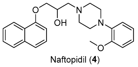 Another aspect to be considered as a starting point for future studies is the involvement of this scaffold in the design of selective derivatives of α1A and α1D receptor subtypes. An example could be represented by the drug repurposing of Naftopidil (Figure 6), used for benign prostatic hyperplasia management. Naftopidil, an arylpiperazine-based α1-AR antagonist with a naphthalene group, has demonstrated its potential anticancer activities related to its pharmacological profile in numerous studies [18]. This compound, used in Japan in the treatment of BPH, has emerged as a potential anticancer drug both because it is useful in arresting prostate cell growth but also in decreasing the cell viability of various cell lines such as bladder or renal cell lines. In fact, many research groups have been involved in the development of derivatives tested for their ability to block α1-ARs (specifically α1A, α1B, and α1D) [19,20].
