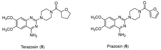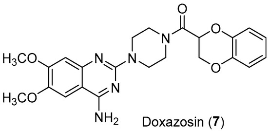 There is a lot of evidence showing the antitumor potential of α1 blockers. There are many relevant examples in the literature of antagonists such as Prazosin (used for the treatment of hypertension) or Terazosin (Figure 7) (used in cases of hypertension or urinary symptoms due to benign prostatic hypertrophy); among the mechanisms highlighted are DNA damage stress induction for the former and cell growth inhibition for the latter [21].