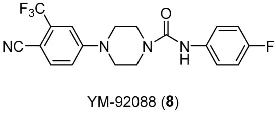 - Kinoyama, I.; Taniguchi, N.; Kawaminami, E.; Nozawa, E.; Koutoku, H.; Furutani, T.; Kudoh, M.; Okada, M. N-Arylpiperazine-1-Carboxamide Derivatives: A Novel Series of Orally Active Nonsteroidal Androgen Receptor Antagonists. Chem. Pharm. Bull. 2005, 53, 402–409. [Google Scholar] [CrossRef]