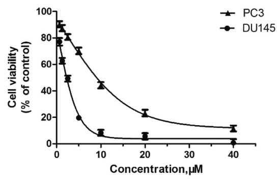 Compound 10 inhibited cell viability in prostate cell lines PC-3 and DU145. All cells were exposed to escalating concentrations of arylpiperazine derivatives respectively for 24 h, and the cell viability was detected by CCK-8 assay [27].