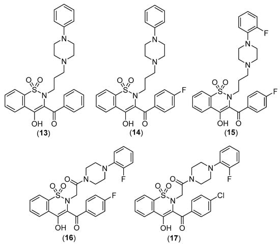 Szczuka et al. have focused their attention on the role of HSPA1 and HSP90AA1, whose levels turn out to be increased in cancerous colorectal lesions. In fact, the expression of HSPA1 and HSP90AA1, key heat shock proteins involved in facilitating neoplastic transformation and cancer development, is already altered in precancerous colorectal lesions and surrounding tissue, to a degree that is dependent on polyp’s potential for malignancy. Consequently, the effect of Piroxicam, Meloxicam, and new arylpiperazine analogues, previously synthesized as analgesic without any ulcerogenic activity [30,31], was tested on the expression of the already mentioned heat shock proteins in colorectal adenocarcinoma lines (HCT 116, Caco-2, and HT-29 cells). These classic drugs have repeatedly shown anticancer properties, acting through both COX-dependent and independent pathways. Nevertheless, the precise molecular mechanisms behind these effects remain to be fully elucidated. The following compounds (Figure 12) first showed reduced cytotoxicity when compared with the corresponding oxicam, and then showed the ability to differently decrease the protein expression of HSPA1 in all cells under examination. In addition, the oxicam analogues exhibited effectiveness in downregulating the expression of HSP90AA1, a trait not observed in classic drugs.