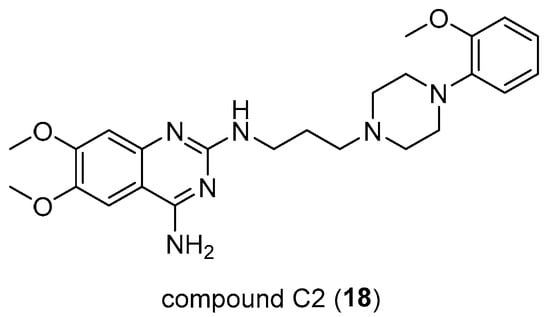 Similarly, the antitumor effect of Doxazosin (Figure 8), an antihypertensive drug used to treat benign prostatic hyperplasia, has been further investigated. This drug has the arylpiperazine scaffold in its structure and its antiproliferative effects have been demonstrated in several cell lines. It could act by different mechanisms such as the activation of TGF and IkB, the inhibition of PKB/AKT activation and angiogenesis, or by autophagy and Suzuki et al. proved that Doxazosin sensitizes different tumor cells to Osimertinib, a tyrosine kinase inhibitor [22].