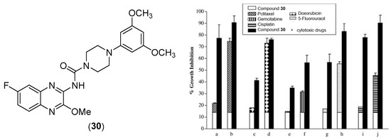 Lee et al. evaluated quinoxalinyl–piperazine derivatives as possible anticancer agents [52]. Among them, they identified one as a growth inhibitor of cancer cells and specifically demonstrated that this compound is a G2/M-specific cell cycle inhibitor and inhibits anti-apoptotic Bcl-2 protein with p21 induction. Compound 30 (Figure 15) inhibited the proliferation of several lines of cancer cells, including breast, skin, pancreas, and cervix cells, as shown in Table 8. This inhibition is dose dependent.