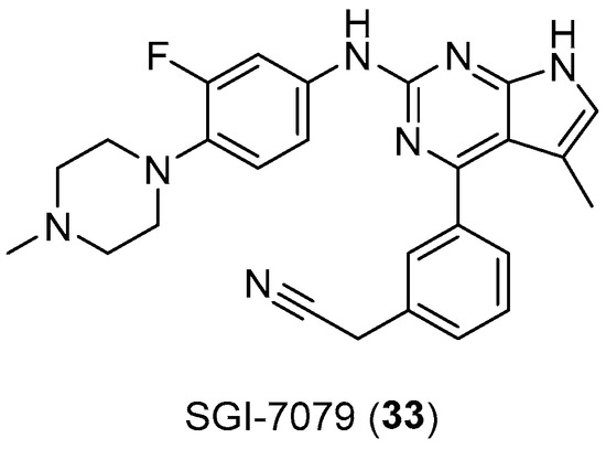 Another arylpiperazine-based compound, SGI7079 (33, Figure 17), was found to be a potent selective Axl inhibitor, the effect of which manifests itself in a dose-dependent manner with an IC50 of 58 nM. Indeed, the overexpression of AXL has been found in numerous cancer types, which most often correlates with a worse patient prognosis. Thus, by inhibiting the kinase, these arylpiperazine derivatives should be able to overcome the resistance of EGFR inhibitors in some cancers [55].