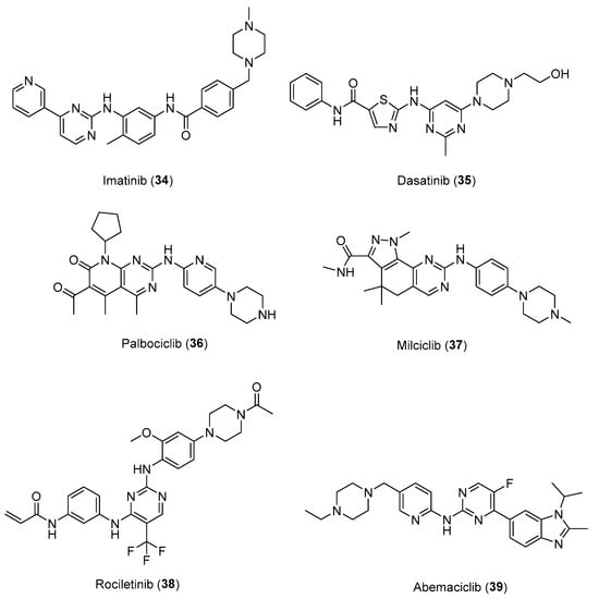 Notably, these findings have also translated into the market entry of some arylpiperazine-based drugs, such as Imatinib (34), Dasatinib (35), Palbociclib (36), Milciclib (37), Rociletinib (38), and Abemaciclib (39) (Figure 18), as targeted therapies approved by FDA [56,57,58] for the treatment of cancer. These results, together with the current studies described in this review, clearly emphasize the role of arylpiperazine derivatives not only on the CNS but also in cancer.