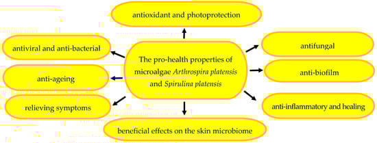 There are many substances, including those of natural origin, e.g., antimicrobial peptides, which can be used as ingredients of cosmetics to limit the presence of microorganisms on the skin surface [115,116,117]. In turn, the multidirectional action of various biologically active chemical compounds from A. platensis and S. platensis microalgae applied topically on the skin or orally includes their anticancer [4,115,118,119,120], antioxidant [4,121,122,123,124], and anti-aging [40,125,126] properties.