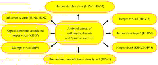 The antiviral activity of microalgae is associated with their rich profile of active metabolites, i.e., proteins, lectins, polysaccharides, and photosynthetic pigments. Some active compounds have been used in genetic engineering for recombination of nucleic acids and production of new vaccines, e.g., against SARS-CoV-2 [127,128]. As a source of sulphated polysaccharides, polyphenols, and lectins with antiviral and immunomodulatory properties, microalgae are a promising strategy in the fight against viruses. The mechanism of their action is based on the inhibition of viral replication and enhancement of human resistance to viral infections [23]. Polysaccharides, calcium spirulan, a sulphated polysaccharide composed of rhamnose, 3-O-methyl-rhamnose, 2,3-di-O-methyl-rhamnose, and 3-O-methylxylose, uronic acids, sulphate groups, and calcium ions chelated with sulphate groups isolated from S. platensis and other microalgae increase the resistance of the organism to infection [23,46]. They inhibit the replication of herpes simplex virus (HSV-1, HSV-2), cytomegalovirus (HCMV), herpes virus 5 (HHV-5), herpes virus 8 (KSHV/HHV-8), measles virus (MeV), mumps virus (MuV), herpes virus type 6 (HHV-6), influenza A virus, Kaposi’s sarcoma-associated herpes virus, and HIV-1 virus [22,23,46]. Phycobiliproteins, primarily, c-phycocyanin and allophycocyanin, inhibit infections caused by influenza A and B viruses. The mechanism of their action involves blocking the replication of the viruses and their entry into host cells [23]. The antiviral effects of A. platensis and S. platensis is presented in Figure 2.