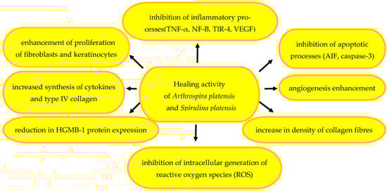 There is a new trend consisting of searching for natural pigments to be used as substitutes for synthetic ones, which may be toxic. The phycocyanins from S. platensis included in a cream proved able to enhance the wound-healing effect, demonstrating effective inhibition of the growth of Aspergillus fumigatus, A. niger, Candida albicans, and Escherichia coli at the same time [173]. This fact, along with the findings that spirulina and chlorella supplementation accelerates angiogenesis, proliferation of epithelial cells, and formation of granulation tissue in diabetic rats, shows that these ingredients may be recommended for wound therapy in diabetic patients [174]. The active metabolites of S. platensis can be regarded as potential agents to be used in complementary and conventional medicine to heal various mechanical, chemical, and thermal wounds [175]. Antioxidant peptide ML11 obtained from the A. platensis transglutaminase core domain exerts an antioxidant effect via intracellular ROS scavenging. Nanofibres encapsulated with peptide ML11 have a positive effect on the wound-healing process. They can be used as a biomaterial or a biopharmaceutical drug restoring redox balance in adjuvant wound-healing therapy [121]. Selected mechanisms supporting the wound-healing process after the use of A. platensis and S. platensis microalgae are shown in Figure 3.