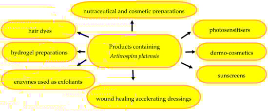 Cyanobacterial biocompounds can be ingredients of products expanding the diversity of cosmetic formulations used as sunscreens and moisturisers in skin care and treatment of dermatological conditions [203]. Microalgal active metabolites contribute to the development of innovative products, e.g., S. platensis enzymes have been used as exfoliating agents to develop hydrogel preparations and cosmeceuticals [204]. With their properties, microalgae are promising components of the most modern natural cosmetics and cosmeceutical formulations based on environmentally friendly microalgal biomolecules replacing synthetic products [205]. The bioactive components of microalgae can serve as substitutes in the new trends in pharmaceutical, cosmetic, and cosmeceutical biotherapies [62,206]. In turn, the combination of spirulina and probiotics constitutes a new functional food strategy bringing positive effects on human health [207]. The application of A. platensis and S. platensis microalgae in various pharmaceutical and cosmetic products is presented in Figure 5.