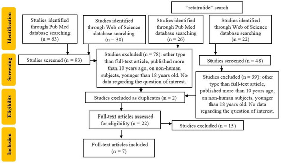Because the titles and abstracts lacked data about the retatrutide molecule, we performed another search of PubMed and Web of Science library databases with “retatrutide” and obtained 48 articles (26 on PubMed and 22 on Web of Science, respectively). After applying filters for language (English) and publication type (original articles), 9 articles remained. After removing the duplicates, 7 articles remained for full assessment.