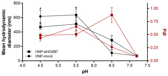Stability of HNP-siHOXB7 (square, n = 3) and HNP-mock (circle, n = 3) after exposure to acid pH. Mean hydrodynamic diameter (black) and PDI (dark red). Results are expressed as mean ± standard error of the mean. ANOVA followed by Bonferroni (* p < 0.05).
