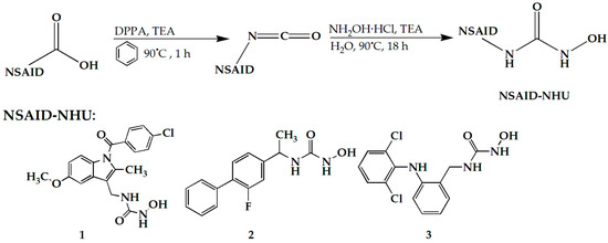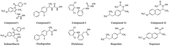 In our previously published study [11], compounds 1, 2, 3, 11, and 12 were synthesized by replacing the carboxyl functional group of five NSAIDs (indomethacin, flurbiprofen, diclofenac, ibuprofen, and naproxen, respectively) with N-hydroxyurea and hydroxamic acid functional groups (Figure 1 and Scheme 1 and Scheme 2). These NSAIDs are non-selective COX-1 and COX-2 inhibitors, used in therapy as anti-inflammatory drugs. Synthesized compounds 1, 2, 3, 11, and 12 proved to be the best dual COX-2 and 5-LOX inhibitors presented in this study. The obtained IC50 values were in the range of 5.26–83.42 µM for COX-2 inhibition and in the range of 1.04–5.71 µM for 5-LOX inhibition. In addition, weak COX-1 inhibition was observed for all of them (IC50 > 100 µM), indicating good COX-2/COX-1 selectivity. Since inhibition of both COX-2 and 5-LOX enzymes is known to be a significant strategy in the treatment of colorectal and pancreatic cancers [12,13,14], compounds 1, 2, 3, 11, and 12 were further evaluated as cytotoxic agents. Compounds with the best cytotoxic activity against tested cancer cell lines were 1, 2, and 3. These compounds also showed good antimigratory effects, while compound 3 did not show toxic effects on zebrafish embryos at therapeutic doses [15].