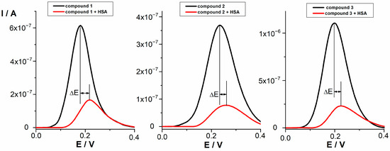 DPV voltammograms of compounds 1, 2, and 3 (0.05 mmol/L) before and after interaction with HSA (0.01 mmol/L).