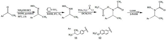 - Flynn, D.L.; Capiris, T.; Cetenko, W.J.; Connor, D.T.; Dyer, R.D.; Kostlan, C.R.; Nies, D.E.; Schrier, D.J.; Sircar, J.C. Nonsteroidal anti-inflammatory drug hydroxamic acids. Dual inhibitors of both cyclooxygenase and 5-lipoxygenase. J. Med. Chem. 1990, 33, 2070–2072. [Google Scholar] [CrossRef] [PubMed]