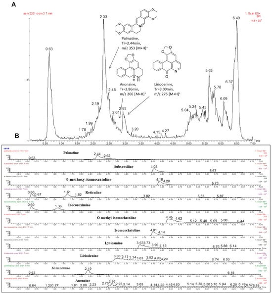 UHPLC-MS chromatograms. (A) From the methanolic extract of the leaves of A. squamosa (EMAS) with some identified alkaloids. (B) From the standard samples of alkaloids used as a standard.