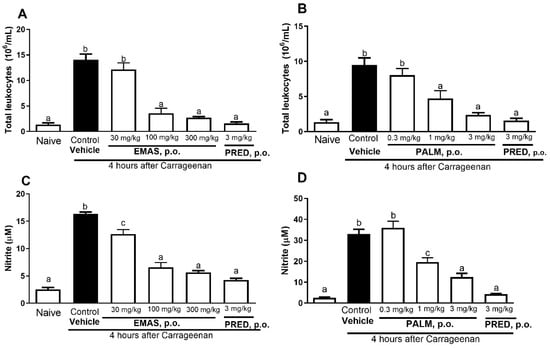 Effects of oral administration of EMAS and palmatine on leukocyte migration (A,B) and nitric oxide production (C,D) in pleurisy model induced by carrageenan. Animals received, by gavage, EMAS (30, 100, 300 mg/kg), palmatine (0.3, 1, 3 mg/kg), vehicle (naïve and control groups), or prednisolone (PRED, 3 mg/kg), and, after 1 h, intrathoracic injection of carrageenan was given to groups, except naïve. Each bar represents mean ± SEM of 6 animals. Letters a, b and c indicate significant differences among groups according to Tukey’s multiple comparison test.