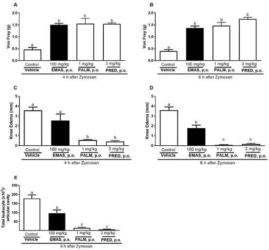 Six hours after the induction of joint inflammation by zymosan (Figure 3E), leukocyte recruitment was reduced by the treatment with EMAS (51%), palmatine (91%), and prednisolone (96%). Regarding leukocyte recruitment, the results of the groups treated with palmatine and prednisolone showed no statistical difference between themselves; however, both groups differed from the control group and EMAS-treated group (Figure 3E).