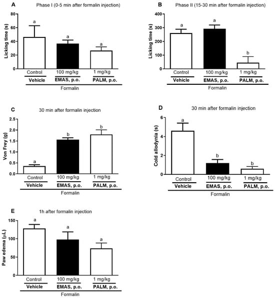 Effects of oral administration of EMAS and palmatine on formalin test. One hour before applying 30 μL of 1% formalin, animals were orally treated with EMAS (100 mg/kg), palmatine (PALM 1 mg/kg), or vehicle (control group). First phase represents neurogenic phase (A), while second phase is inflammatory phase (B). Paw withdrawal threshold (Von Frey test) (C) and cold sensitivity (D) were performed immediately after formalin test. Formalin-induced edema was measured one hour after formalin application (E). Each bar represents mean ± SEM of 5 animals. Letters a and b indicate significant differences between groups according to Tukey’s multiple comparison test.