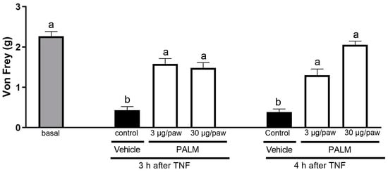 The effects of the intraplantar administration of palmatine on TNF-induced mechanical hyperalgesia. One hour before the injection of 20 μL of TNF into the right hind paw, the animals were intraplantar treated with saline solution or palmatine (PALM 3 and 30 µg/paw) in the same region as the inducing agent. Three and four hours after the TNF injection, mechanical hyperalgesia (Von Frey test) was analyzed. In addition, the basal response to mechanical stimulus was performed before treating the animals. Each bar represents the mean ± SEM of 5 animals. The letters a and b indicate significant differences among groups according to Tukey’s multiple comparison test.