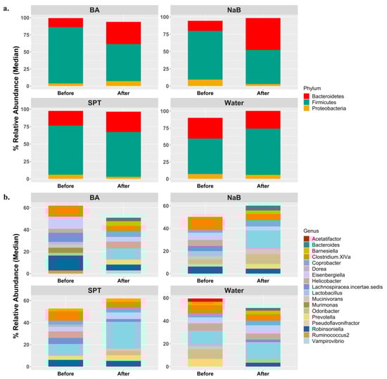 Beta diversity analysis, which is used to analyse community-level differences between sample diversity, was carried out, and the communities between two time points were statistically tested at both the phylum (Figure 2b, Supplementary Table S2) and genus (Figure 2d, Supplementary Table S2) levels. In phylum-level time comparisons based on Bray–Curtis, there was no significant difference between the control (Water_After vs. Water_Before p value = 0.898) and SPT (SPT_After vs. SPT_Before p value = 0.425) groups. However, both BA (BA_After vs. BA_Before p value = 0.03) and NaB (NaB_After vs. NaB_Before p value = 0.018) treatments caused a significant shift in bacterial compositions. In genus-level time comparisons, in agreement with phylum-level results, no significance was obtained from the control (Water_After vs. Water_Before p value = 0.158) and SPT (SPT_After vs. SPT_Before p value = 0.13) groups, while there was a significant change observed in response to treatment with BA (BA_After vs. BA_Before p value = 0.03) or NaB (NaB_After vs. NaB_Before p value = 0.027) for Bray–Curtis. Jaccard dissimilarity index-based calculations and analysis also showed similar results (Figure S3, Tables S2 and S4).