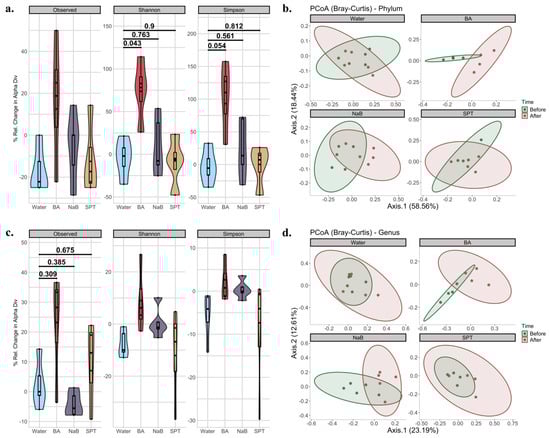 Alpha and beta diversity metrics are used to explain within and between sample diversity, respectively. In alpha diversity measurements, richness and evenness within a sample are evaluated by counting different features and measuring the distribution of the features based on their relative abundance, respectively []. In this study, three metrics were employed to analyse alpha diversity. First, observed features were used to explain bacterial richness only []. Secondly, the Shannon diversity index, which takes both richness and evenness into account by providing equal weight to both, was used []. Lastly, the Simpson index, another metric examining both richness and evenness like Shannon diversity, was used. Unlike the Shannon index, it gives more weight to evenness []. All metrics were calculated separately at the phylum (Figure 2a) and genus (Figure 2c) levels. When the percentage of changes between two time points was calculated, and changes in treatment groups were compared to the changes in the control (water) group in time, and the BA vs. control group changes and comparisons only gave statistical significance at the phylum level for Shannon and Simpson indices (Observed: KW p value = 0.249. Shannon: KW p value = 0.046; BA vs. Control p.adj = 0.043, NaB vs. Control p.adj = 0.763, SPT vs. Control p.adj = 0.900. Simpson: KW p value = 0.049; BA vs. Control p.adj = 0.054, NaB vs. Control p.adj = 0.561, SPT vs. Control p.adj = 0.812.) (Figure 2a). On the other hand, none of the comparisons yielded significance at the genus levels for any of the three indices based on p.adj values (Observed: KW p value = 0.098; BA vs. Control p.adj = 0.309, NaB vs. Control p.adj = 0.385, SPT vs. Control p.adj = 0.675. Shannon: KW p value = 0.102. Simpson: KW p value = 0.109).