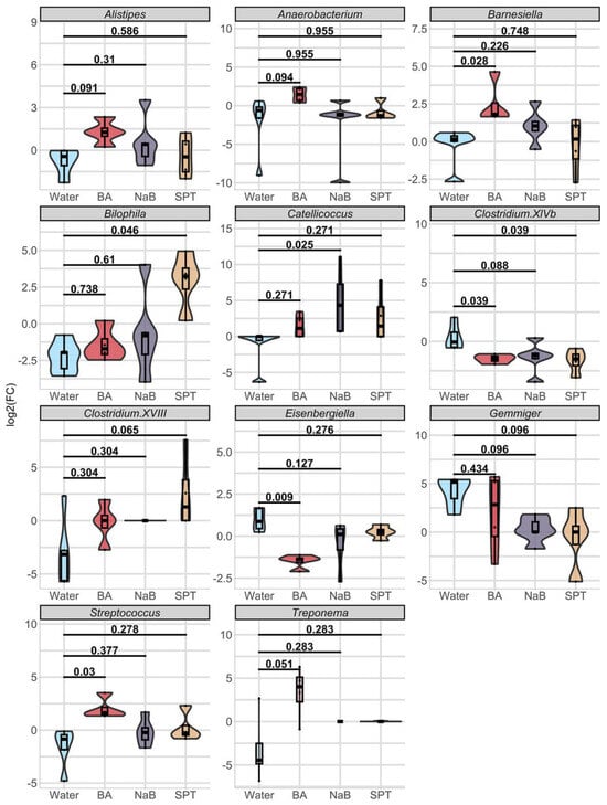 At the genus level, timewise comparisons of each genus showed no significant difference (Wilcoxon p.adj ≥ 0.1) (Figure S4). When we tested the log2 fold changes of each genus in response to treatment compared to changes in the control group, we obtained significant changes in eleven genera (Figure 3, Table S3). Among three treatments vs. water comparisons, the BA treatment caused the most diverse alterations in the mouse gut bacteria genus, as shown by seven of the eleven genera based on statistical analysis from the BA vs. control changes comparison (Figure 3, Table S3). Of these, Alistipes (BA log2(FC)median = +1.27, p.adj = 0.091), Anaerobacterium (BA log2(FC)median = +1.46, p.adj = 0.094), Barnesiella (BA log2(FC)median = +1.81, p.adj = 0.028), Streptococcus (BA log2(FC)median = +1.61, p.adj = 0.03), and Treponema (BA = from 0% relative abundance to a median of 0.029% relative abundance, p.adj = 0.051) levels increased with BA; on the other hand, Costridium XIVb (BA log2(FC)median = −1.45, p.adj = 0.039) and Eisenbergiella (BA log2(FC)median = −1.37, p.adj = 0.0096) abundance decreased.