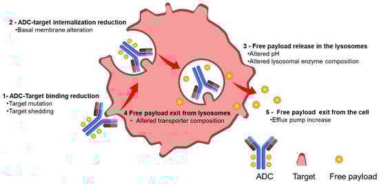 Acquired or primary resistance to ADC therapy has to be considered a multifactorial event due to the different steps involved in the ADC mechanism of action [13]: antigen recognition, internalization, payload release inside the lysosome, and trafficking inside the cell to reach the target (Figure 2).