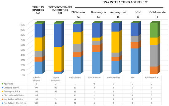 Among the different classes of DNA-interacting payloads, PBD, with a DNA crosslinking mechanism of action, is the most explored with 66 ADCs developed but only 1, loncastuzumab tesirine, approved, 11 ADCs clinically active, and 15 under preclinical development. The Indoline benzodiazepine (IGN) class of payloads has up to now proved to be the less successful class with 13% of the products abandoned at the clinical stage and 62% at the preclinical stage, no approved ADC, and only 2 clinically active. Anthracyclines, at present, represent the chemical class with more compounds still undergoing development either at a clinical or preclinical stage (58%). Similar statements can be made about the duocarmycin class with 36% of currently active ADCs at either a clinical or preclinical stage.