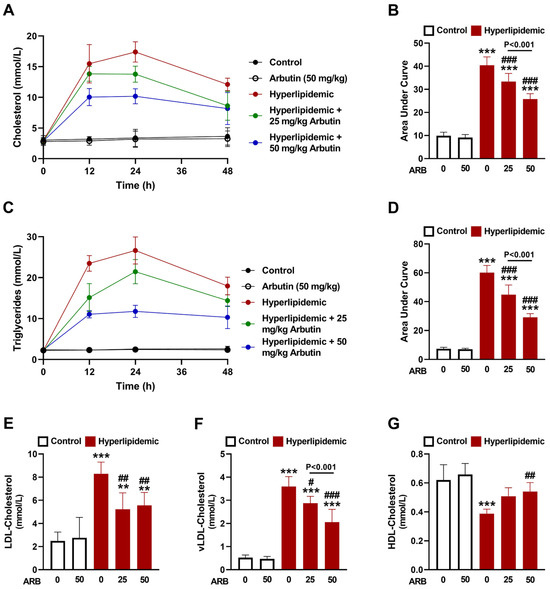 ARB decreased plasms CHOL (A,B) and TG (C,D) levels at 12, 24, and 48 h, and decreased LDL-C (E) and vLDL-C (F) and increased HDL-C (G) at 48 h in hyperlipidemic rats. Data are mean ± SEM (n = 6). ** p < 0.01 and *** p < 0.001 vs. Control. # p < 0.05, ## p < 0.01, and ### p < 0.001 vs. Hyperlipidemic.