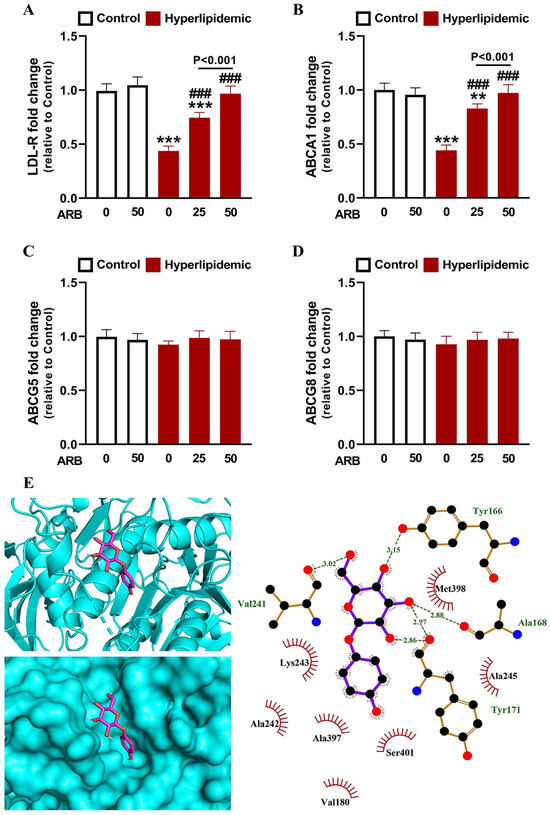 ARB upregulated LDL-R (A) and ABCA1 (B) mRNA and showed no effect on ABCG5 (C) and ABCG8 (D) mRNA in liver of hyperlipidemic rats. Data are mean ± SEM (n = 6). ** p < 0.01 and *** p < 0.001 vs. Control and ### p < 0.001 vs. Hyperlipidemic. (E) Molecular docking of ARB with LDL-R PCSK9 binding domain showing the crystal structure and amino acid residues involved in polar bonding and hydrophobic interactions.