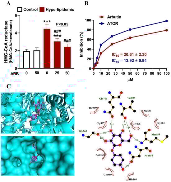 ARB suppressed HMGCR activity in the liver of hyperlipidemic rats (A). Data are mean ± SEM (n = 6). *** p < 0.001 vs. Control, and ### p < 0.001 vs. Hyperlipidemic. (B) In vitro HMGCR inhibition activity of ARB and atorvastatin. Data are mean ± SEM (N = 3). (C) Molecular docking of ARB with HMGCR showing the crystal structure and amino acid residues involved in polar bonding and hydrophobic interactions.