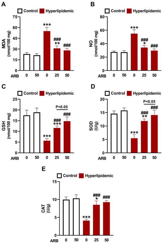 ARB mitigated oxidative stress in hyperlipidemic rats. ARB decreased liver MDA (A) and NO (B) levels, and enhanced GSH (C), SOD (D), and CAT (E) in hyperlipidemic rats. Data are mean ± SEM (n = 6). * p < 0.51, ** p < 0.01, and *** p < 0.001 vs. Control, and ### p < 0.001 vs. Hyperlipidemic.