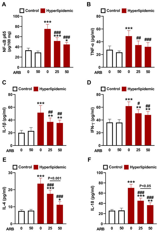 ARB attenuated inflammation in hyperlipidemic rats. ARB suppressed liver NF-κB p65 (A) and plasma TNF-α (B), IL-1β (C), IFN-γ (D), IL-4 (E), and IL-18 (F). Data are mean ± SEM (n = 6). * p < 0.51, ** p < 0.01, and *** p < 0.001 vs. Control. # p < 0.05, ## p < 0.01, and ### p < 0.001 vs. Hyperlipidemic.