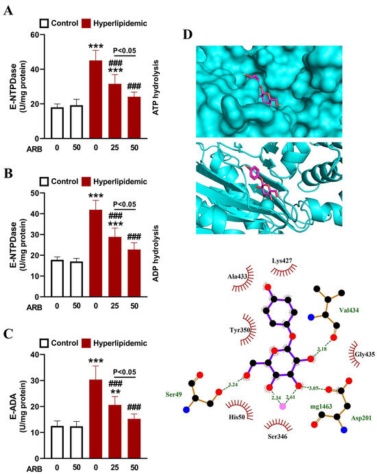ARB suppressed E-NTPDase (A,B) and E-ADA (C) activities in lymphocytes of hyperlipidemic rats. Data are mean ± SEM (n = 6). ** p < 0.01 and *** p < 0.001 vs. Control, and ### p < 0.001 vs. Hyperlipidemic. (D) Molecular docking of ARB with E-NTPDase showing the crystal structure and amino acid residues involved in polar bonding and hydrophobic interactions.