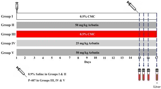 Thirty adult male Wistar rats (160–180 g) were kept under standard conditions (temperature 23 ± 1 °C and humidity 50–60%) and provided standard pellet food and water ad libitum. To investigate the anti-hyperlipidemic effect of ARB, 500 mg/kg P-407 (Sigma, St. Louis, MO, USA) was injected intraperitoneally (i.p.) to induce dyslipidemia [16,67] and control rats received physiological saline. The rats were divided into five groups, two normal groups (I and II) and three dyslipidemic groups (III, IV and V), each with six rats (n = 6), as outlined below (Figure 9):