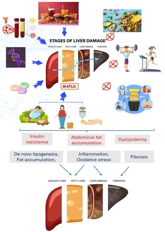 Factors related to the occurrence of Metabolic-Associated Fatty Liver Disease (MAFLD) and the possibility of the inhibition of this condition. An unhealthy diet, sedentary lifestyle, obesity, insulin resistance/diabetes, dyslipidemia, genetics, and excessive drug consumption are related to the pathogenesis of MAFLD and its progression to fibrosis, cirrhosis, and cancer. A healthy diet, physical exercise, and weight loss can improve metabolic conditions and can prevent or reduce MAFLD.