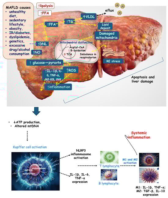The liver in the context of MAFLD. Lifestyle and metabolic alterations lead to an increased lipolysis of visceral adipose tissue, stimulating de novo lipogenesis, and an increase in FFA and VLDL (and a consequent efflux of this lipoprotein). Increased glucose intake results in increased pyruvate and Acetyl-CoA production, leading to increased TCA activity. Furthermore, there is augmented β-oxidation resulting in mitochondrial dysfunction. The consequences are mitochondrial dysfunction, altered mtDNA, an imbalance in respiration (reduction in ATP production), and RE stress. All these events are related to increased inflammation and ROS, which results in apoptosis and liver damage. Systemic inflammation occurs due to Kupffer cell activation. DNL: de novo lipogenesis; FFA: free fatty acid; IL: interleukin; JNK: c-Jun N-terminal kinase; M2: macrophage; mtDNA: mitochondrial DNA; NF-KB: nuclear factor-KB, NO: nitric acid; NLRP3: NLR family pyrin domain-containing 3; ROS: reactive oxygen species; VLDL: very-low-density lipoprotein; TG: triglyceride; TNF-α: tumor necrosis factor-α; TCA: tricarboxylic acid cycle.