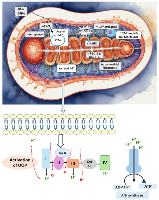 MAFLD is profoundly linked to lipid metabolism which involves two pathways, starting with the exogenous pathway, in which the body’s first contact with fat is ingested in the diet [,]. Through chylomicrons produced by enterocytes, these lipids are transported through the lymphatic ducts until they reach the bloodstream and then continue the endogenous route through the encountering of these lipoproteins with hepatocytes and the deposition of lipoprotein content in these cells. Then, the triglycerides synthesized in hepatocytes are secreted as VLDL (very-low-density lipoprotein). As it reaches extrahepatic tissues, it loses lipid content and is transformed into IDL (intermediate-density lipoprotein) and LDL-c (low-density lipoprotein cholesterol) [,,,]. It is possible to better understand the relationship between MAFLD and other diseases through understanding various metabolic processes that occur in mitochondria, such as the tricarboxylic acid cycle (TCA), the β-oxidation of fatty acids, urea synthesis, and respiratory chain [,]. When using fuels such as glucose and fatty acids to obtain adenosine triphosphate (ATP), any disturbance in one of these mechanisms can cause severe damage to the cell and, consequently, to the tissue. Mitochondrial changes include a reduction in mitochondrial DNA (mtDNA), structural lesion formation, reduced activity of respiratory chain complexes, and damage to β-oxidation [,,]; therefore, the metabolic repercussions of these changes can be devastating for the body [,,,,].