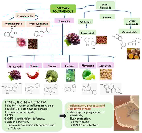 Diet can profoundly influence metabolic diseases. Food diets rich in fats, sugar, and ultra-processed foods are related to inflammatory and oxidative processes. A diet abundant in fruit and vegetables can reduce risk factors such as dyslipidemia, hyperglycemia, hypertension, obesity, inflammation, and oxidative stress [,,,,,,,], which are essential in the development and progression of MAFLD [,,,]. Phytocompounds comprise many natural chemical compounds that are beneficial to counter metabolic diseases [,,,,,,,,,,]. Polyphenols are part of this group, and more than a thousand have been identified. Significant components of this class are phenols, polyphenols, carotenoids, phytosterols, isoprenoids, saponins, and dietary fibers [].