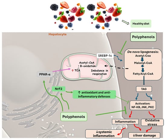 Some polyphenols can reverse part of the liver damage related to inflammation, oxidative stress, or mitochondrial dysfunction, acting directly on the functioning, synthesis, and degradation of mitochondria and optimizing the functions of these cellular organelles. Among these polyphenols are anthocyanin, baicalin, catechin, curcumin, chlorogenic acid, didymin, epigallocatechin-3-gallate, luteolin, mangiferin, puerarin, punicalagin, resveratrol, and silymarin [,,,,,,,,,,,]. The incidence of liver disorders and associated conditions such as overweight/obesity, diabetes, and metabolic syndrome has grown exponentially. For these reasons, more research must be conducted to propose ways to mitigate risk factors for these conditions []. Therefore, this review aims to investigate the impact of oxidative stress, inflammation, mitochondrial dysfunction, and the role of phenolic compounds in managing MAFLD.