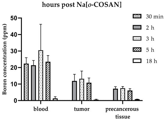 Boron concentration values (ppm) for blood, tumor, and precancerous tissue at different time-points post Na[o-COSAN] injection: 30 min, 2 h, 3 h, 5 h, and 18 h.