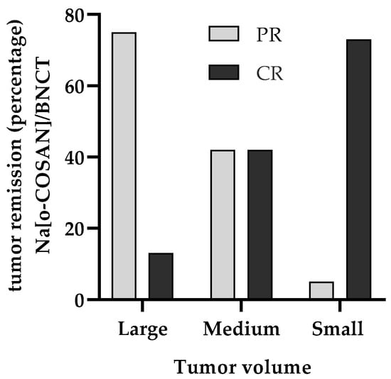 Therapeutic effect of Na[o-10COSAN]/BNCT. Percentage of tumors with partial remission (PR) and complete remission (CR) considering tumor volume at the time of irradiation: small (<10 mm3), medium (≥10 <100 mm3), and large (≥100 mm3).