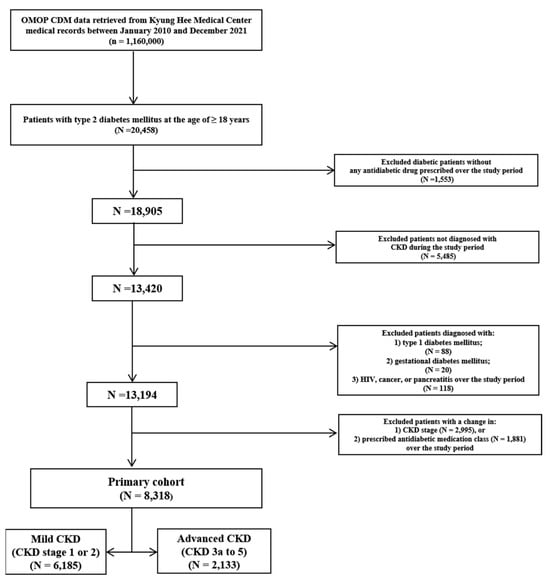 Included patients were those aged 18 years or older who were diagnosed with CKD, as well as type 2 DM, and received at least one antidiabetic drug. In our patient cohort, the index start date was defined as the first date of antidiabetic drug prescription with ≥ 365 days of previous clinical observation history documented in the database. The cohort exit date was the date of last documented observation in the database before study termination (i.e., 31 December 2021). Excluded patients were those with a change in prescribed antidiabetic drug class or CKD stage or those diagnosed with gestational or type 1 DM, cancer, human immunodeficiency virus (HIV) infection, or pancreatitis over the study period [55,56]. Patients with a change in prescribed antidiabetic drug class or CKD stage were excluded due to the inherent limitations of OMOP CDM and its analytical tool, ATLAS [21]; individual patient records could not be followed over time (e.g., change in medication use after a change in CKD stage or the occurrence of MALA), but only the population statistics of variables of interest were shown.