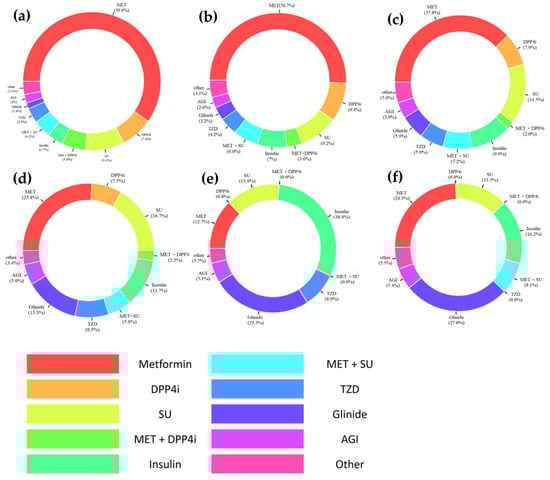 Patterns of prescribing antidiabetic drug regimen in patients with chronic kidney disease (CKD) by stages: (a) mild CKD (i.e., stage 1 to 2); (b) CKD stage 3a; (c) CKD stage 3b; (d) CKD stage 4; (e) CKD stage 5 receiving dialysis; and (f) CKD stage 5 not receiving dialysis. Abbreviations: AGI, alpha-glucosidase inhibitor; DPP4i, dipeptidyl peptidase-4 inhibitor; Glinide, meglitinide; MET, metformin; SU, sulfonylurea; TZD, thiazolidinedione.