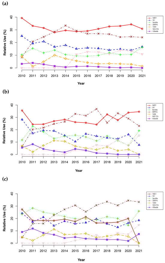 For advanced CKD stage 3b or worse (Figure 3c), MET was the most commonly prescribed antidiabetic drug in 2010. However, its use was substantially reduced from 30.1% in 2010 to none in 2021, with a substantial increase in the use of DPP4is (5.1% in 2010 to 36.0% in 2021); the use of DPP4is surpassed MET from 2013. A remarkable reduction in MET use was observed in 2021 (20.4% in 2020 to 0.0% in 2021), with substantial increases in prescribing SGLT2is (7.4% in 2020 to 16.0% in 2021), as well as insulin (14.8% in 2020 to 29.0% in 2021) and glinides (1.8% in 2020 to 7.4% in 2021).